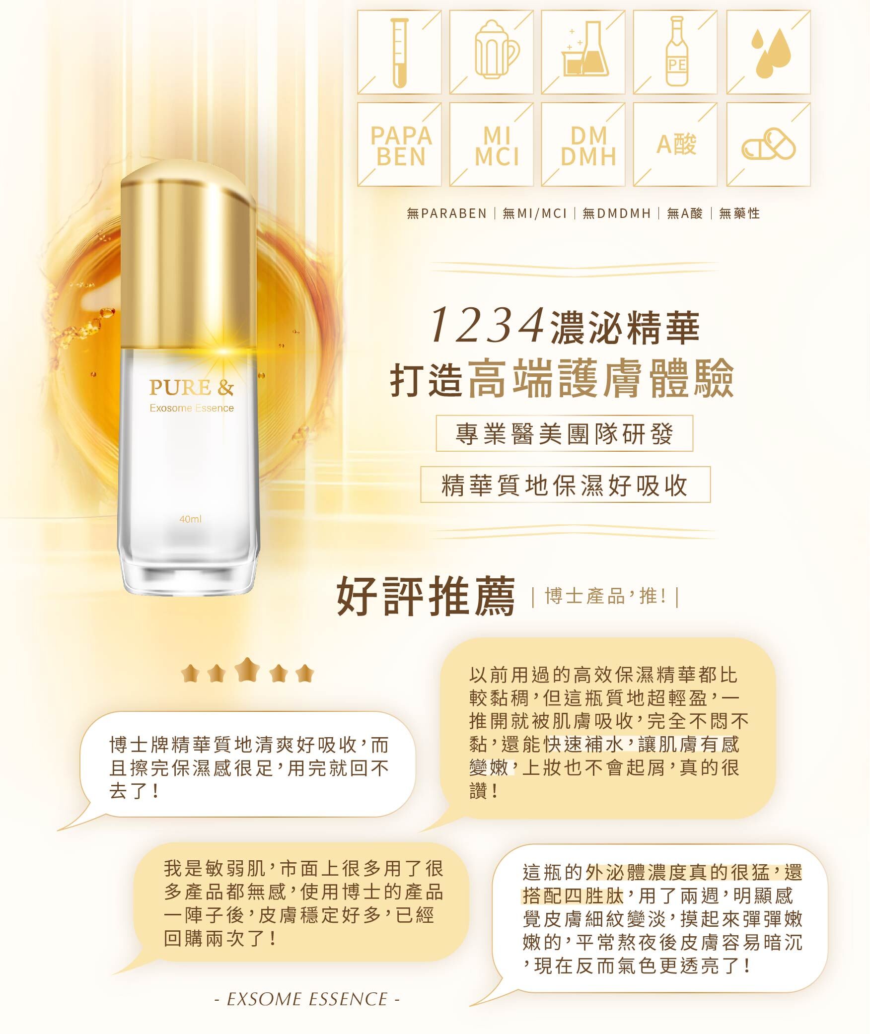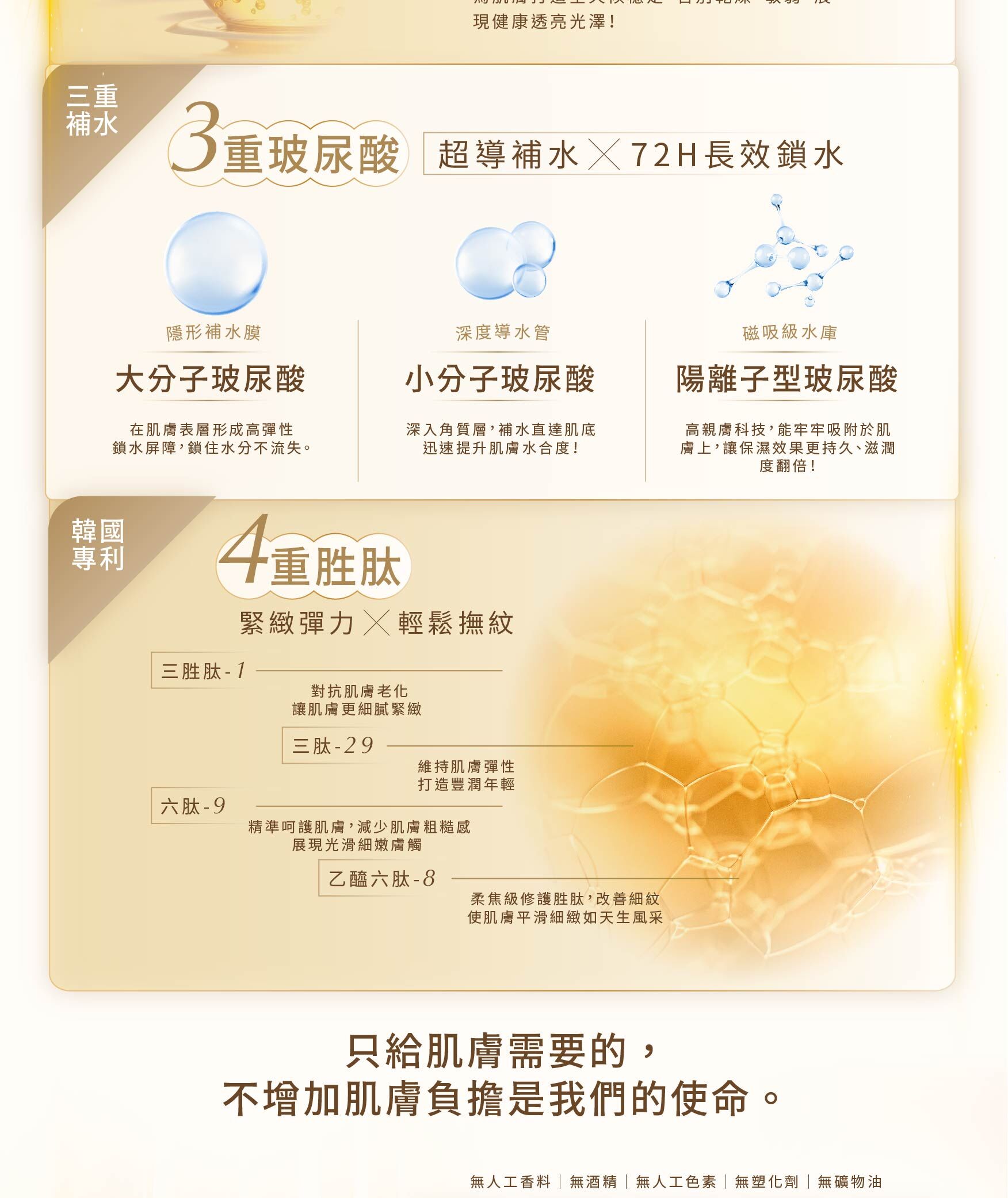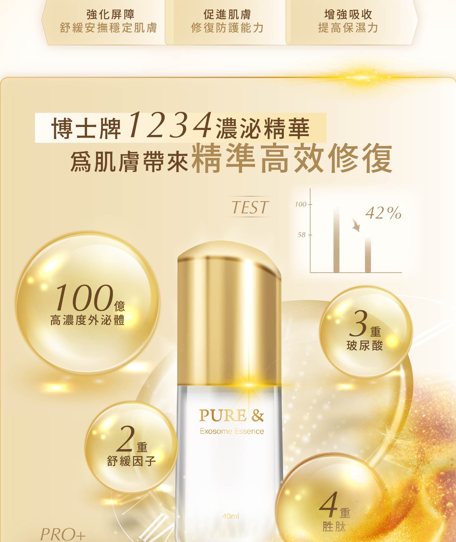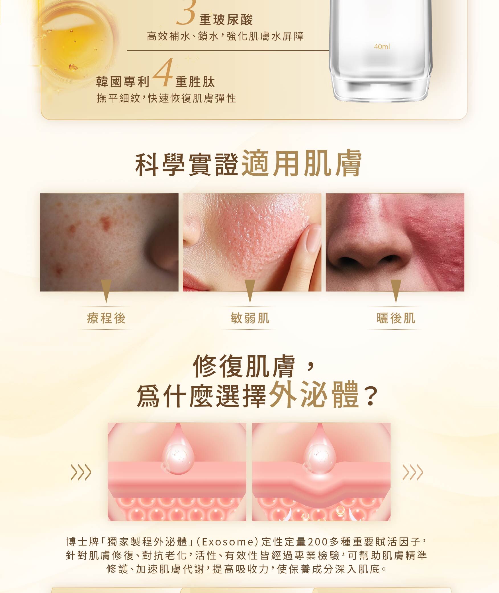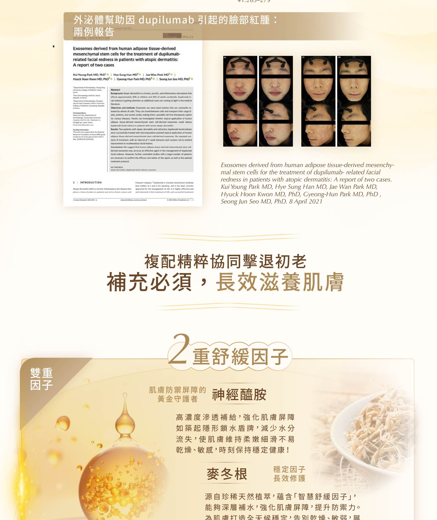 主要成分:高濃度外泌體、三重玻尿酸、神經醯胺、專利麥冬根、專利胜肽